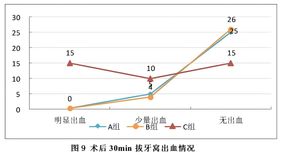 实验结果显示:拔牙30min后,观察三组出血情况,A、B组患者出血率远低于C自然愈合组,表示两种材料对拔牙窝出血情况有积极作用,可以减少拔牙术后出血风险,且A组(博纳塞)即时止血效果更显著。