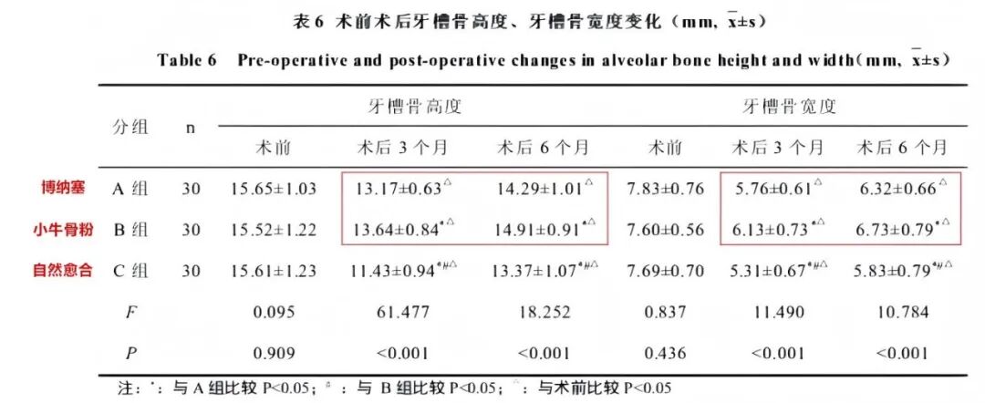 数据显示:经术前术后3、6个月牙槽骨高度、宽度的对比观察,表示在减少牙槽骨高度、宽度丧失方面,小牛骨粉组表现最佳,博纳塞组紧随其后,自然愈合组最差。